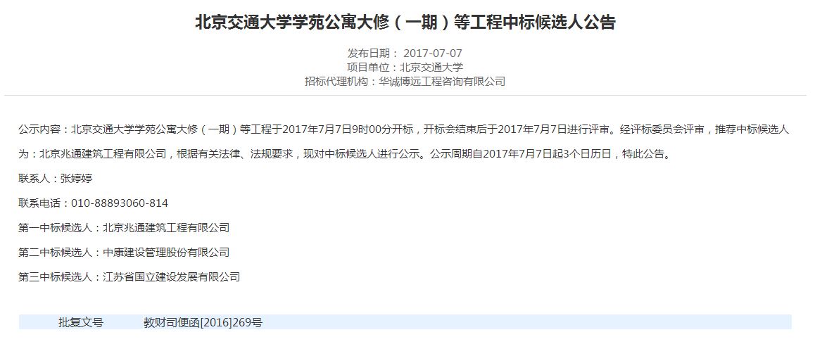北京交通大学学苑公寓大修(一期)等工程中标候选人公告